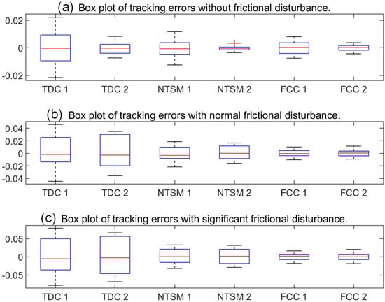 TDC 1 and TDC 2 represent the TDC algorithm applied to joints 1 and 2, respectively. Similarly, NTSM 1, NTSM 2, FCC 1, and FCC 2 represent the NTSM and FCC algorithms applied to joints 1 and 2 of the robotic arm. From Figure 14, it is apparent that the TDC algorithm has the largest error distribution, with the greatest distance between the upper and lower limits, but there are no outliers. The error distribution of the NTSM algorithm is relatively stable, with a lower height of the box and a smaller distance between the upper and lower limits, except for an outlier in NTSM 2. The error distribution of the FCC algorithm is the most stable, with the lowest average height of the box and the smallest distance between the upper and lower limits, and there are no outliers.