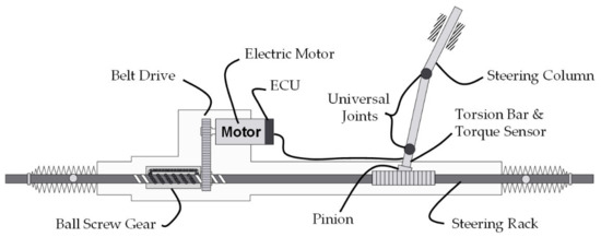 Modern steering systems in vehicles are equipped with an electrical motor to assist the driver during driving maneuvers. Depending on the positioning of the electric motor, different variations of EPS exist [23]. In this work, the motor of the steering system is located parallel to the rack of the system, representing an axle parallel (apa) EPS. A simplified sketch of the system is displayed in Figure 1.