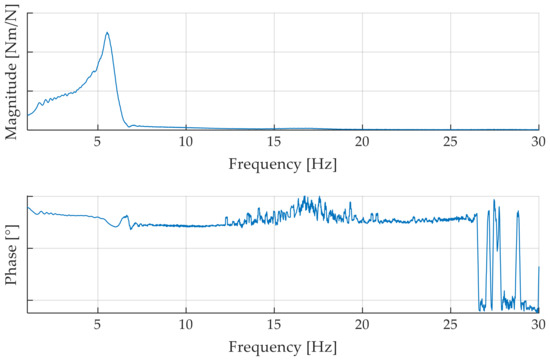 To demonstrate the occurring control performance deterioration during the test, measurements with a steering wheel angle of 20° and an implemented virtual spring stiffness of 400 N/mm are conducted. Within 50 s, the frequency is exponentially increased from 0.1 Hz up to 5 Hz, which lays above the reported frequency input ranges of 2.0 Hz in [30], 2.8 Hz in [27], 3 Hz in [23,31] and 4 Hz in [32] and is, therefore, considered sufficiently dynamic. Figure 7 depicts the bode plot of the transfer function from measured rack displacement to the measured rack force , introduced by the RLA, calculated as the feedforward control performance