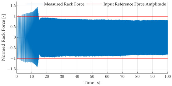 As a result of the steering system characteristics, the resulting rack force amplitude exhibits deviations from the reference amplitude along the frequency range. An exemplarily resulting normed rack force course in the time domain is presented in Figure 4. Here, the reference amplitude indicates the desired amplitude of the input force sine sweep reference signal from 1 Hz to 30 Hz and ideally coincides with the amplitudes of the measured rack forces. At 13.8 s, the rack force displays an overshoot of 43.6% compared to the reference amplitude. For increasing time, which is equivalent to increasing frequency, the amplitude drops to 81% of the reference signal. These deviations hinder reliable comparison.