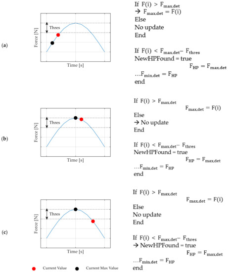 An update happens if the current value is larger than the previously stored value, otherwise the update is suspended (see Figure 5b). Since the force measurement is accompanied with measurement noise from the load cell, a threshold value is defined, which allows a distinction between the discovery of a new high point and noise-induced force reductions. As soon as the measured force value drops below a threshold, represented as the value which is lower than the currently stored maximum, a high point detection is triggered to update the currently reached force amplitude , as displayed in Figure 5c. Furthermore, the currently detected minimum value is initialized with the high point value. Then, the search for a low point is performed identically.