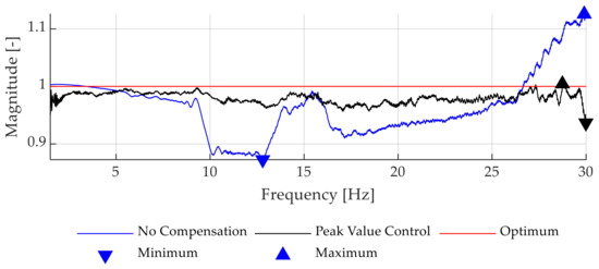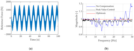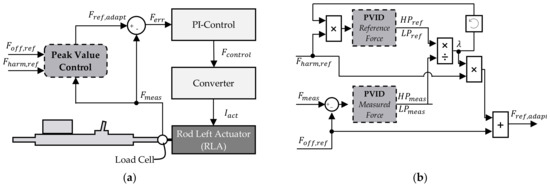 The adaption of the reference signal is conducted before the PI control structure of the test bench and includes information from the measured force and the reference forces and (see Figure 6a). Figure 6b displays a block diagram of the peak value control implementation). The harmonic reference signal is a multiplication with the currently active correction ratio, directly fed to the PVID algorithm, whereas the measured force is offset adjusted by subtracting the reference offset value before being analyzed by the PVID. The correction ratio λ is calculated according to Equation (2) or Equation (3) and multiplied with the harmonic reference signal. Finally, the adapted harmonic reference signal is added to the offset reference value, representing the adapted reference signal, which is fed to the control structure. The separated analysis is conducted to only adapt the high-frequency inputs, since the low-frequency signals possess high control accuracy.