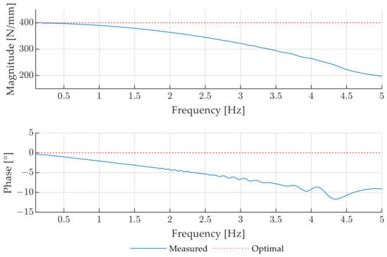 Ideally, the magnitude course equals the defined spring stiffness, and the phase delay is zero.