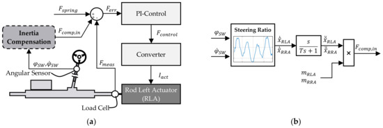Implementation of inertia compensation. (a) Location within the complete control structure of the steering system test bench. (b) Detailed representation of the algorithm.