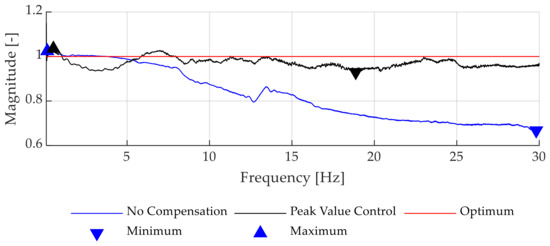 Table 5 demonstrates that the IC approach successfully reduces the resulting deviations between the measured magnitude and the reference spring stiffness. The best solution concerning the magnitude accuracy is derived for IC without phase compensation. Incorporating the DC and DCvar approach leads to an increase of 15% and 13.3% for the maximum deviation, respectively. On average, the phase compensation exhibits a 50% increase compared to IC alone. Still, all three approaches reduce the maximum occurring stiffness error by at least 83% and on average by 81.2%, demonstrating the improved control performance for the investigated application.
