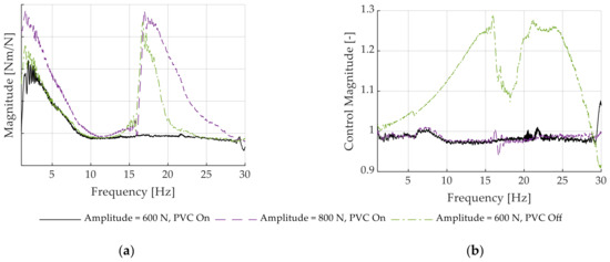 Due to the occurring friction and backlash in the system in combination with an active servo motor, steering systems are nonlinear, which means that the identified transfer function is only valid for the exact condition of the test. To compare the results of different applications of whole steering systems, the boundary conditions of the measurement, such as the force amplitude, need to be held constant, requiring high dynamic performance control. Extrapolating the results outside the reference state is only valid for linear, time-invariant systems [29]. This requirement becomes clear when considering the support force of the servo motor, which does not correlate linearly to the rack force. Therefore, reduced or increased rack forces lead to different torsion bar torques and, therefore, to varying assistance forces, which change the share of the required steering torque of the driver. Consequently, the magnitude of the transfer functions increases or decreases, complicating a comparison for different rack force amplitudes.