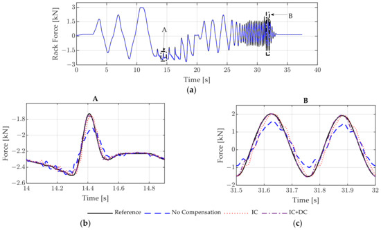 The contribution of the individual compensation approaches can be understood by the measured courses. In the case of no implemented compensation approach, the PMLSM inertia causes deviations at 14.3 s in Figure 16b, where an increase of the contact force is observed in advance to the rise of the reference force. Here, negative contact forces represent pressure on the load cell. When the steering maneuver is initiated at 14.3 s, the steering system moves to the center region, therefore, reducing the rack force. Since the PMLSM is not able to follow the movement immediately, an overshoot occurs where the decrease in the rack force is primarily caused by the missing movement due to inertia of the PMLSM. At the maximum reference force of the time course at 14.4 s, both the amplitude and phase deviation of the measured force without compensation are visible. When incorporating the IC approach, the measured force deviation is reduced for both previously described points, resulting in a better approximation of the reference signal. The phase delay, as evaluated earlier, is still present. When IC and DC are implemented simultaneously, the reference force is represented accurately by the measured force for both amplitude accuracy and the phase delay. A similar tendency can be observed in Figure 16c. Here, due to the implemented control improvements, the reference signal and the measured force with IC + DC are almost indistinguishable. These observations also underline the improved dynamic performance of the force control for an application where the tuning parameters were not derived.