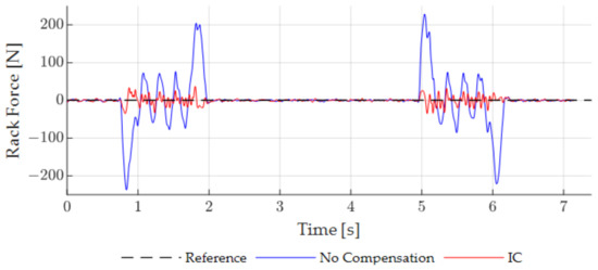 For the third comparison, a basic setup is investigated, which is utilized for the evaluation of the steering power on a test bench (see [27]). For these tests, the steering wheel angle is defined to obtain a constant steering wheel velocity over a large portion of the complete steering stroke. The rack force is held at a constant value. For each new test, the rack force is increased until the torsion bar torque exceeds a predefined limit. At this point, the steering power limit is reached. For the herein investigated test setup, a constant force of 0 N is predefined, while the steering wheel maneuvers at 800°/s. Since the rack force reference signal is constant over time, no DC is implemented since it has no effect on the control performance. The time courses of the measured rack force with and without IC is displayed in Figure 17.