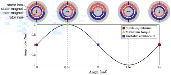 where denotes the amplitude, the pole pair number of the stator and rotor, i.e., the periodicity of the torque, and the (adaptive) phase [34] of each pair , as shown in Figure 2.
