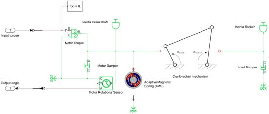 The use case under consideration is a four-bar linkage system (crank-rocker mechanism), as introduced in Section 2.3. A schematic overview is shown in Figure 4, showing the system modelled in Simscape. The motor is modelled as an ideal torque source, and is coupled with an inertia and a block implementing friction. The magnetic spring is added on the motor-side, which is parameterized as either a sinusoidal magnetic spring or the proposed adaptive magnetic spring. Note that alternative magnetic spring parameterizations can be considered as well (e.g., free-shape), although these are not considered in this study. A custom Simscape block is created which implements the kinematic transformation of the linkage mechanism. On the load-side, an inertia and damper are added, connected to the rocker-side of the linkage.