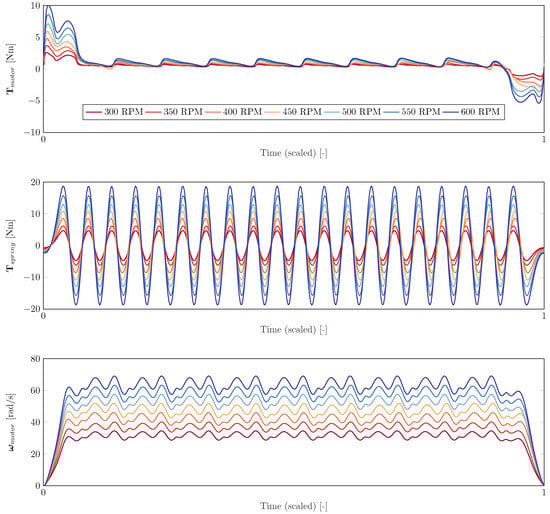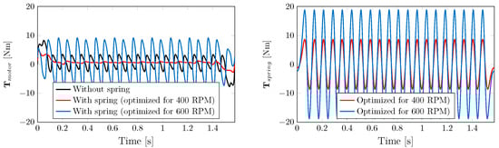 If we solve the above optimization problem for a mean speed of 400 RPM instead, we obtain reductions in RMS and maximum motor torque of 56% and 42%, respectively. A key difference however is the optimized design of the magnetic spring. The amplitude A of the magnetic spring is optimized to 8.6 Nm, with phase rad, while the phase is similar to the result for the 600 RPM case, the amplitude reduced drastically, since lower torques are required due to the lower operating speed.
