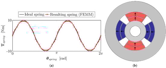 Additionally, the design flexibility demonstrated in a recent publication [32] allows for shaping of the magnetic spring torque. The shaping is achieved through two different approaches: (i) Fourier decomposition of the desired characteristic, combining several springs with sinusoidal characteristics into a single assembly; (ii) re-shaping of the magnetic domains, resulting in a free-shape limited only by magnet and back iron manufacturability (e.g., minimum thickness, air gap size, feasible magnetizations, etc.). For the sake of simplicity, and given the fact that shaping optimization has been covered in previous publications we intentionally omit it herein.