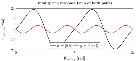For example, the embodiment of the concept shown in Figure 2 relies on two locking devices that can each unlock one of the stators. Released stators can be re-positioned by the principal actuator of the drivetrain (e.g., PMSM servo), due to the coupling rotor–stator, to a desired position where the stators are locked again. The main consequence of this innovation is that no secondary actuators are required apart from low-power, low-cost brake actuators to vary the spring characteristic. Take note, this concept is feasible for only sinusoidal spring characteristics.