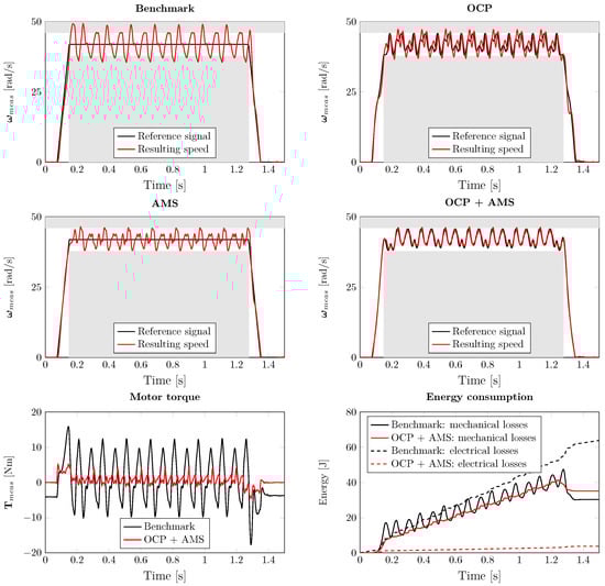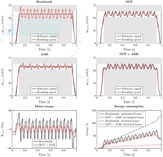 The results for the 400 RPM case are shown in Figure 15 as follows: the speed reference signals , the resulting measured motor speed and the applied constraints on the speed for each of the four cases. Especially for the benchmark, the speed constraints are violated regularly. In the top right plot, the resulting motor torques are shown, indicating the OCP + AMS case requires a significantly reduced torque with respect to the benchmark. The bottom right plot shows the mechanical and electrical losses for both the benchmark and the OCP + AMS case. In particular, the electrical losses are reduced significantly in the latter case. For the 550 RPM case, the results are shown in Figure 16. Similar conclusions can be drawn for the 400 RPM case.