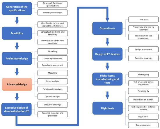 Figure 1. The first step is the generation of the specifications on the basis of the requirements at aircraft level. This phase also includes the definition of the aeroshapes in clean and morphed configuration. Then, in the “feasibility” task the architecture potentially applicable are investigated by means of light models. By means of dedicated criteria the most promising architecture is selected. At this point the preliminary design is addressed; this phase foresees the realization of a conceptual FE model, the optimization of the main design parameters and the aeroelastic assessment through an additional suited stick model of the winglet. Then the “Advanced design” task is faced. Its block was highlighted since the activities presented in the present work are part of it. In this phase, a refined FE model of the winglet is realized and stress, functionality and dynamic analyses are implemented. The activities described in this work are part of the advanced design and focuses on the movable part. The executive design is then addressed with the aim of realizing a prototype for the demonstration on ground. Though the ground tests (GT) the load bearing capability and the functionality are verified and eventual problems identified for the next design assessment. At this point, the executive drawings of the items for the fight tests (FT) are finalized. Left and right hand versions of the winglet are thus manufactured. Tests on ground are then performed to verify their functionality and load bearing capability in view of the final qualification to get the permit-to-fly. After this step they are installed on the aircraft and the verification of the fully integrated structure and of the different subsystems addressed. Finally, the flight tests are performed.