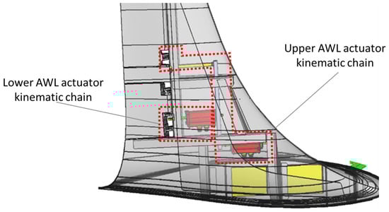 Figure 8, the model of the AWL (left) and a detail of the kinematic chain (right) are illustrated. In the detail, the finger-like mechanism driving the flap deflection was highlighted and the three main parts, that is to say, the trailing edge the intermediate rib the stinger crossing the rear spar are evident. Another important detail is the shaft that characterizes the upper flap kinematic chain.