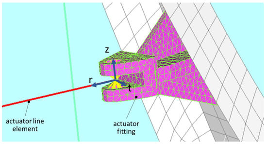 Figure 9 a detail of the modelling of the actuator-fitting joint is illustrated with the local reference system. A spider element (tinted yellow in scheme) was used to connect the lug nodes to the center of the joint. Coherently to what mentioned above, the rotational DOF around the