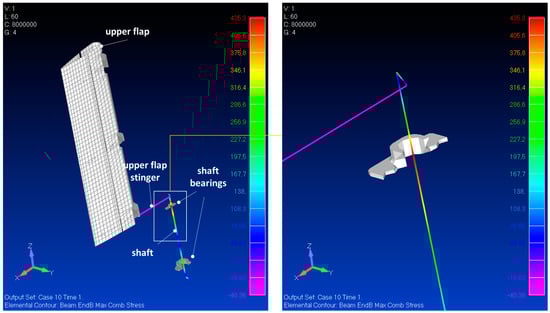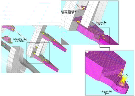 t, normal to the others. In the same picture, the link between the shaft and the bearing is illustrated too. Also in this case, a spider rigid element was used to constraint some nodes of the bearing, enabling only rotations around the axis of the shaft. The same approach was also implemented for the upper arm of the shaft and for its connection to the upper flap stinger (the detail in