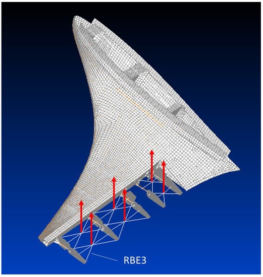 Figure 12 was implemented. In practice, spider nodes made of RBE3 rigid elements were used to transmit the loads to the rib of each box-shaped part of the movable surfaces. This type of rigid elements in fact, differently from the RBE2, do not alter the stiffness but distribute forces. Just one spider per each of the two box shaped parts of the lower flap was used, being its span extension really limited. For the upper flap, to better reproduce the variation of the load along the span direction, two rows of spiders were considered. Three types of load configurations were simulated. the corresponding distribution is summarized in