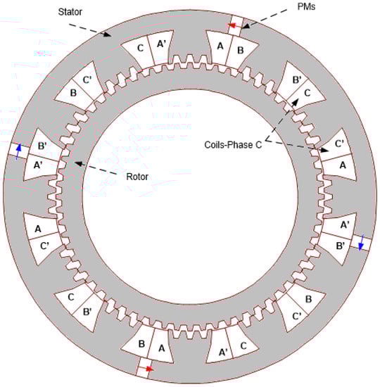 The proposed 3-phase LS–DSPM case study is presented in Figure 2. The designed machine operates at 50 rpm and is able to deliver about 10 kW. This corresponds to a rated torque of 2000 N.m. The studied machine has 48 small stator teeth (Ns) and 64 small rotor teeth (Nr) (this is why it is called a 48/64 structure). The main dimensions and material characteristics are the same as those of the machine studied in [] and are given in Table 1. To improve the performance of the machine studied in [], whose stator contains four pieces of PMs for magnetic field excitation, the stator of the new proposed structure contained six PMs magnetized in a tangential direction. The armature winding adopted was a 3-phase double-layer winding structure, shown in Figure 1. The armature coils were wound around 12 salient stator-tooth poles (Np = 12).