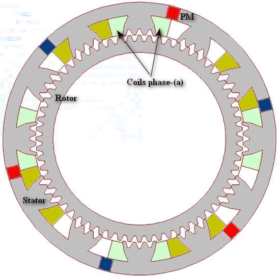 - The second solution to improve the torque ripple consists in modifying the geometry parameters of the conventional structures and optimizing the design of unconventional ones [,,,,,,,,,]. In [], the design optimization and comparison of two synchronous structures operating at low speed, which have PMs in the stator, are achieved. It has been shown that introducing permanent magnets (PMs) in variable reluctance machines (Figure 1) can improve output torque. In [], a novel structure is proposed to reduce the cogging torque and the mutual inductance. In [], two LS–DSPM machines with and without the Vernier effect were designed and optimized using genetic algorithms. The results reveal that the introduction of the Vernier effect principle in the LS–DSPM machines ameliorates the EMF form and reduces torque ripple. In [], the study of the forms and dimensions of the teeth that minimize torque ripple is presented. In [,,], it is demonstrated that the number of PM pairs and their location in the stator, the number of poles, the phase number, and the combination of the stator/rotor teeth numbers are parameters that influence strongly the machine performance and more specifically the torque ripple.