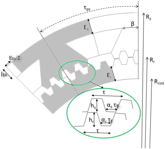 In order to operate the proposed machine at the same speed as the structure studied in [], the stator tooth pitch was varied as given in (2). This action also reduces the air gap surface between the stator/rotor poles when they are in the aligned position (Figure 3b). This position corresponds to the complete overlap between the rotor/stator poles. The flux density reaches its maximum in this position. In contrast to the case when the tooth pitches stator/rotor are equal (Figure 3a), the flux linkage surface (air gap distance δ) in the small teeth of the stator/rotor pole was not equal (Figure 3b).