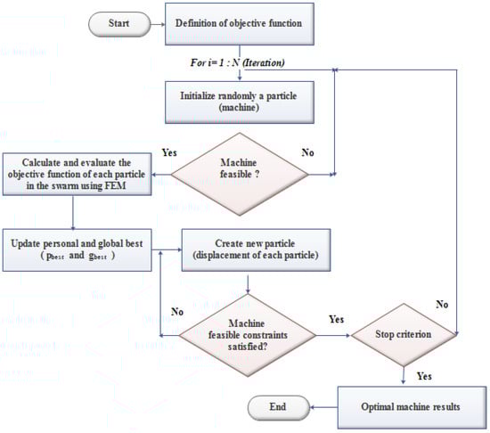 The design process optimization via the PSO method is given in Figure 5. The optimization problem was written in the form of a Lua script program that was associated with FEMM software for the finite element electromagnetic analysis.