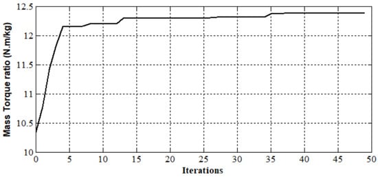 The evolution of the first objective function relative to the global parameters of the machine as a function of the number of iterations is presented in Figure 6, and the corresponding optimal parameters are illustrated in Table 4. The maximum torque density (the optimal machine) was approximatively obtained at iteration 35; beyond that, the objective function remained practically constant. The optimum torque density was 12.4 Nm/kg.