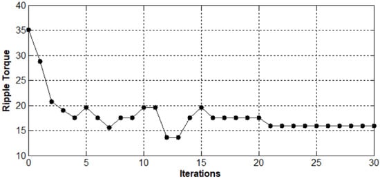 The evolution of the second objective function relative to the small teeth parameters, which corresponds to the ripple torque minimization versus the number of iterations, is presented in Figure 7. In addition, the optimal small teeth parameters obtained after step 2 are given in Table 5. The minimum ripple torque was obtained at iteration 21; beyond that, the objective function remained practically constant. The optimum ripple torque was reached and equal to 16%. With the optimization design approach, the ripple torque was reduced about 53% in comparison with the structure studied in [].
