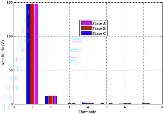 The electromotive force (EMF) generated by the studied machine at 50 rpm (Figure 9) had a sinusoidal shape and a very low harmonic content, THD = 8.8% (Figure 10). This characteristic was obtained by the fact of the non-equality between the value of the stator/rotor tooth pitches and therefore the irregularity of the air gap in the poles of the stator/rotor, which were face-to-face. It can be observed also that the EMF amplitudes of the three phases were equal. Compared to the EMF generated by the reference machine studied in [], the location of permanent magnets allowed for the elimination of the asymmetry of the amplitude of EMF of the three phases.