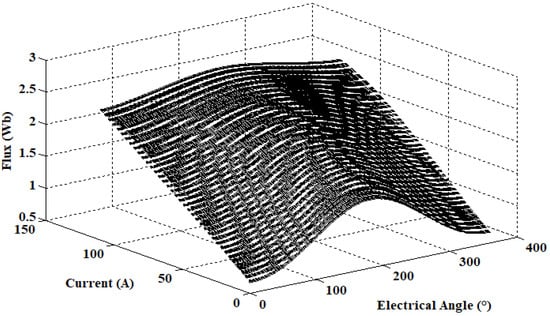 The flux and torque curve of the studied machine are presented in Figure 11 and Figure 12, respectively. These characteristics were obtained by using 2D-FEM, by varying the phase current from 0 A to 120 A with steps of 1 A, and electrical angle from 0° to 360° with step 1°.