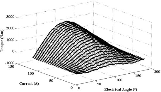 The flux linkage and the torque characteristics had nonlinear properties that strongly depended on the phase current values and the rotor position. These data of the torque and the flux were used in Section 5 to minimize the ripple torque by using TSF control.
