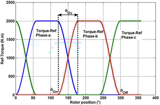 , , are the turn-on, overlap, and turn-off angles, respectively. is the desired torque value. In the studied case 2000 Nm.