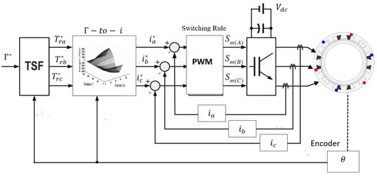 An indirect control method named the torque sharing function (TSF) technique [] was applied in order to minimize the torque ripple produced by the proposed machine. In this method, the imposed reference torque forces the output torque to follow up on it. The form of reference torque used in this work is presented in Figure 13 and given by: