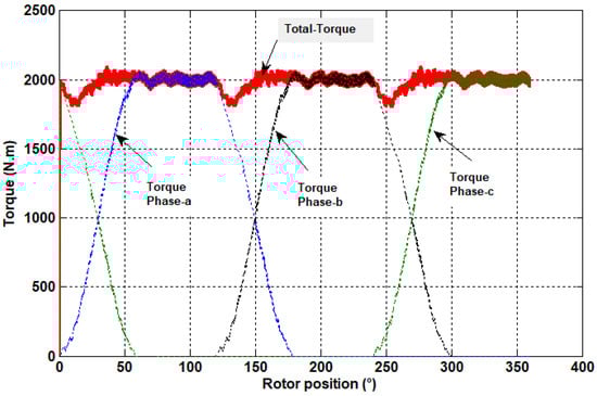 The torque waveform produced by the three phases, as well as the total torque as a function of the position, are shown in Figure 15. The current shape of each phase is presented in Figure 16. It is illustrated that, by applying the TSF control technique, the total torque obtained was practically constant. The torque ripple recorded was around 8%, with a torque maximal value of 2086.2 Nm, a minimal torque value of 1926.2 Nm, and an average torque of 2000 Nm. The ripple was drastically reduced by approximately 50% compared to that obtained with classical supply (Section 4) and by about 76% compared to the structure studied in []. These results allow us to conclude that the application of the TSF method to the control of the proposed machine produces a very smooth torque, which leads to a quiet operation of the machine and vibration reduction.