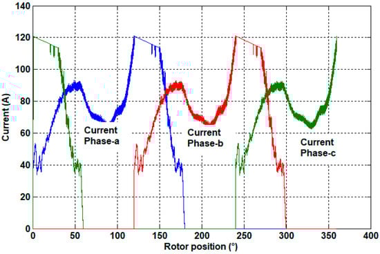 From the shape of the current (Figure 16), between [0°, 180°] it can be seen that, in phase a, for example, the current amplitude varied according to the position of the rotor. In the interval [0°–50°], the current amplitude was around 90 A, while in [50°–100°], the current amplitude was approximately 65 A, and between 100° and 180°, the current amplitude was around 120 A. This indicates that the average amplitude of the current supplying the machine’s phases was around 75 A, which transforms Equation (18) into (19).