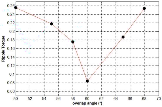 In the commutation zone, when switching off phase a (for example) and powering phase b, the current in phase a decreased at the same time as the current in phase b increased. Due to the inductive property of the machine winding, the downward and upward currents occurred with delay (Figure 16). This phenomenon had a direct impact on the waveform of the total torque because the total torque generated dipped in these commutation zones. An adequate overlap angle leads to reduce the drop in this part of the machine’s torque, and therefore the torque ripple. As shown in Figure 17, the optimum value of the overlap angle for which the torque ripple was minimal is 60°.