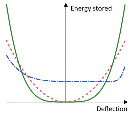 Section 1). Second, with a progressive characteristic, if the neutral zone is left more on one or the other side, the energy to be invested in elastic storage increases with more than the square of the deflection (as with linear elastic springs). Due to the rapidly increasing steepness of potential fields, the motion is limited by built-in energy-absorbing effects, which may recuperate the energy to the countermovement and form virtual “stability walls”. Third, the inclination of the characteristic is different at each of its points, and thus allows its determination by small perturbations (