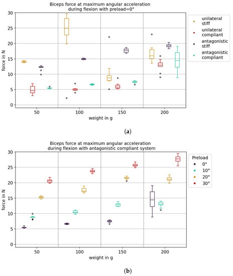 Figure 13a, it becomes visible that the addition of compliant elements to the actuation system led to a reduction of the force at the maximum angular acceleration for both unilateral and antagonistic actuation systems. At certain loads, the actuator system appeared to exhibit resonance (