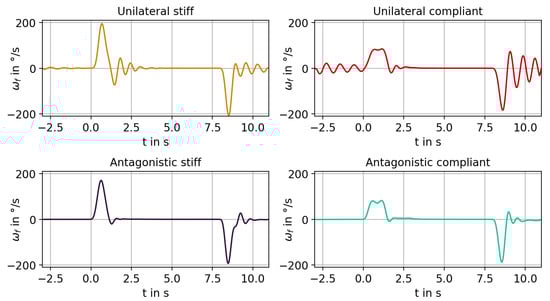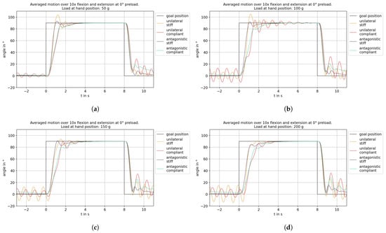 Both compliant configurations exhibited a reduced overshoot compared to the stiff systems: Up to a load of 150 g, stiff systems overshot the target angle of = 90° during flexion, in contrast to the compliant ones. At a load of 100 g, the system appeared to exhibit resonance, with both unilateral configurations overshooting significantly more and resonating longer than at the other loads. A similar behavior occurred for the antagonistic compliant system with a 200 g load. The system appeared to be considerably more likely to oscillate around = 0° in this configuration than at lower loads.