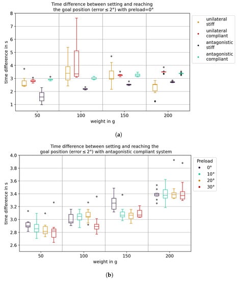 antagonistic compliant system with different preloads. Theoretically, increasing the preload should lead to a stiffening of the system and thus to a decrease in the time difference. However, this was not the case; as the preload increased, the time difference also increased. Increasing the load also resulted in a reduction in the time difference. For a 100 g load, this behavior was masked by the resonant behavior (