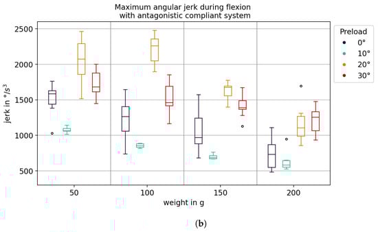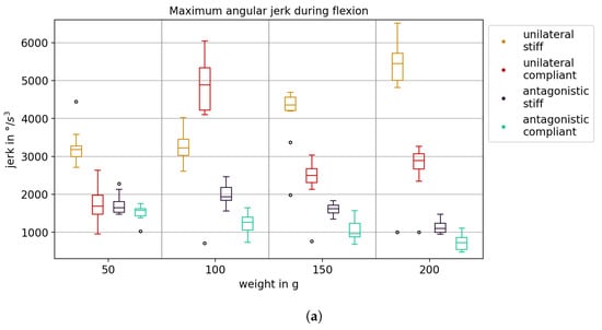 Figure 17a shows the maximum angular jerk during flexion motion for different actuator configurations. The