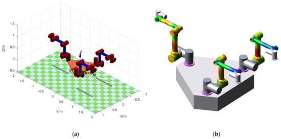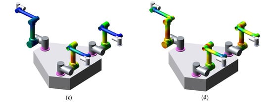 Numerous researchers have sought ways to improve the stability and accuracy of robots through the stiffness matrix. In one study [8], a multi-objective optimization method based on maneuverability and equivalent stiffness was proposed to obtain optimized operating postures with better equivalent stiffness while avoiding singular conformations and staying away from joint rotation limits. Lin [9] established a spatial distribution mapping of the dexterity performance index, the equivalent stiffness index, and deformation for the end of industrial robots in the whole working space, respectively, and selected the robot end position by equivalent stiffness mapping. Qu [10] used the half-axis length of the equivalent stiffness ellipsoid as an adaptation function and performed pose optimization of a seven-axis redundant manipulator based on a genetic algorithm. Cai [11] obtained an empirical formula for the displacement prediction of vibration intensity by the equivalent stiffness matrix and optimized the attitude based on this empirical formula to obtain a vibration-stabilized machining posture. ABB [12] used the equivalent stiffness model for the real-time compensation of machining deformation. In another study [13], the motion accuracy of the manipulator was improved by establishing and optimizing the stiffness index of the task direction. The authors of [14] sought to find a way to improve the stability and accuracy of the robot system through the force–deformation relationship described by the stiffness matrix. Although the above studies improve the accuracy and stability of the robot, they do not consider the motion coupling characteristics of the system. For FMSRs with strong coupling properties, optimizing only the equivalent stiffness may enhance the degree of motion coupling in certain configurations, particularly the degree of motion coupling between the arms. Thus, such methods suffer from the same problems as the energy-based methods. In addition, these stiffness-based methods are mostly specific to a single manipulator and are not directly applicable to FMSRs, which have complex constraint relationships.