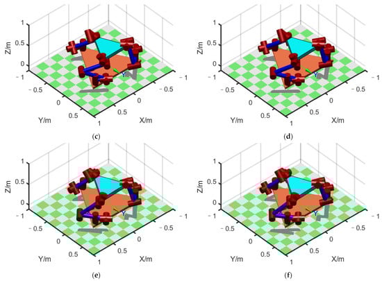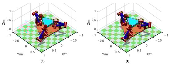 We considered the four points that divided the straight-line path into five equal parts, together with the two endpoints of the path, for a total of six points. We then plotted the configuration diagram separately at these six points to display the changing process of the configuration on the path, as shown in Figure 8a–f. The initial configuration, shown in Figure 8a, was = [114.5°, 11.7°, −78.5°, 56.3°, −63.5°, 160°, −12.5° ], = [−136.8°, −20.0°, −83.2°, 53.7°, −61.0°, 178.4°, −70°], and = [180°, 0°, −143.0°, 55.4°, −2.4°, 0°, 90°].