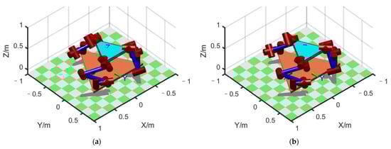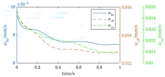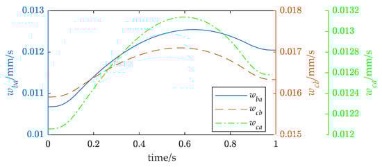 The robot’s rigid body had a mass of 5 kg, and its cross-sectional shape was a waist triangle with a side length of 0.67 m, 0.67 m, and 0.6 m. The three arms of the FMSR hold the three vertexes of the rigid body and move it from the initial pose to the final pose along the straight-line path, where = [0, 0, 0.6, 0, 0, 0] and = [0.1, 0.1, 0.8, 0, 0, 0]. Let the desired external force of the FMSR be a zero vector. The desired trajectory of the rigid body is obtained using trapezoidal interpolation with the parabolic transition. The motion trajectory of the three arms is derived from the motion constraint relationship. The motion trajectory of each joint is obtained using inverse kinematics.