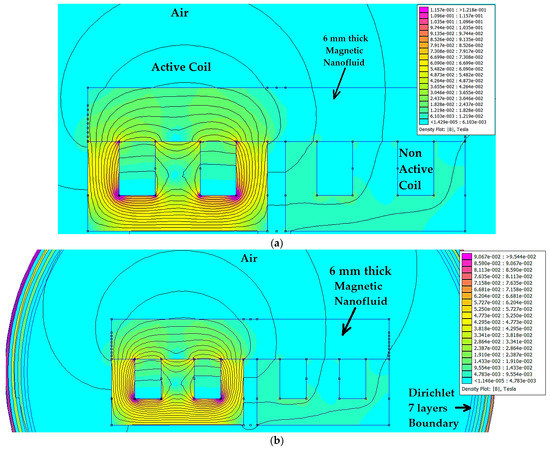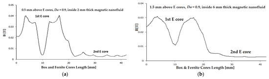 The magnetic field situated at 0.5 mm above E cores was presented in Figure 3a,b, for Da = 0.9 Duty Cycle and Da = 0.72 Duty Cycle. The maximum magnetic field at 0.5 mm distance (Da = 0.9, 2 mm thick magnetic nanofluid) from ferrites increases from 0.04 T, as seen in Figure 3a, up to 0.044 T at 0.5 mm distance (Da = 0.9, 6 mm thick magnetic nanofluid) (see Table 1). The magnetic field remains at the same value of 0.044 T between 4 mm and 6 mm magnetic nanofluid thickness, which means that no additional magnetic nanofluid is needed above the E cores. The 4 mm magnetic nanofluid thickness is the optimum inflation limit.
