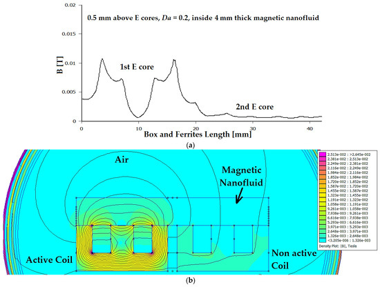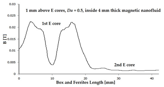 Moreover, the magnetic field at 0.5 mm above E ferrite cores and inside the magnetic nanofluid is shown in Figure 4. These magnetic field values were also introduced in Table 1 (for Da = 0.2). Ins Table 1, all magnetic field values at different distances above E cores and for selected Duty Cycles (Da), 0.2, 0.5, 0.72 and 0.9, are presented.