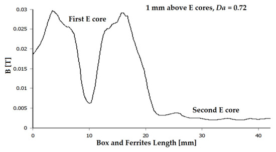If the values of the magnetic field distribution along the two ferrite cores, for Da = 0.5 (Figure 7), are compared with the obtained magnetic field density for two E ferrite cores at Da = 0.72 (see Figure 8), it can be seen that the magnetic field induction has changed from 15 to 17 mT (at 3–4 mm distance), up to 23–25 mT.