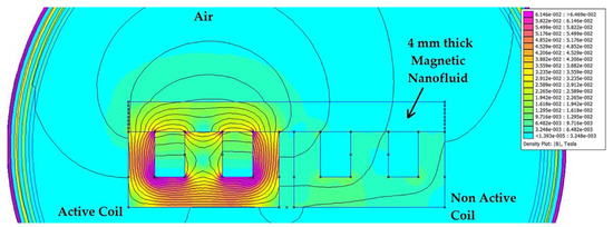 Two-dimensional magnetic field density plot for two E Ferrite cores separated by 2 mm spacer, Da = 0.5 Duty Cycle, 24 mA average current and 4 mm magnetic nanofluid thickness.