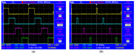 The main role of the electronic drive circuit is to ensure precise control of magnetic field intensity and induction produced by each of the four coils. These four coils, L1, L2, L3 and L4, are activated by rectangular pulse trains, such as in Figure 9a,b.